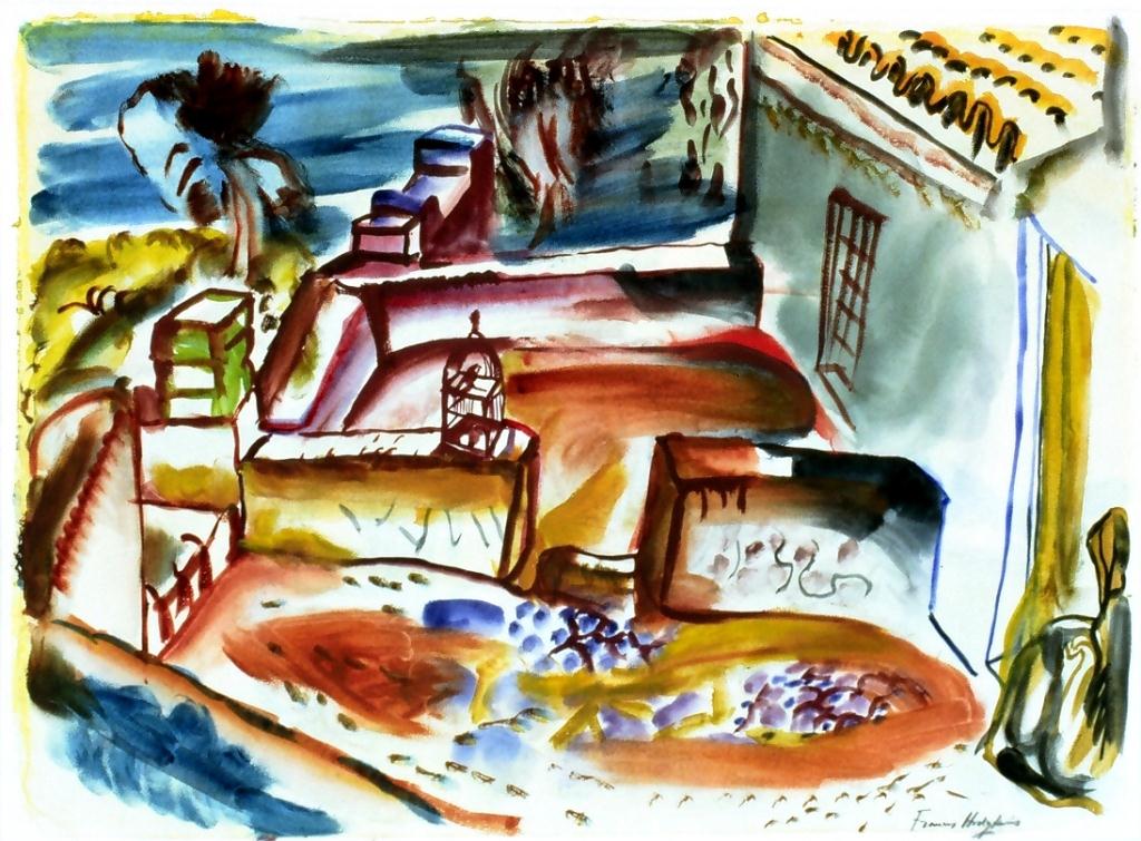 With their high-keyed colour and expert use of watercolour, the paintings Hodgkins produced in Ibiza were just what the artist needed to cement her reputation for adventurous effects. This work went immediately after exhibition into the collection of Eardley Knollys (1902-1991), an English artist of the Bloomsbury School who was a friend of Hodgkins and was also an art critic, art dealer and collector. It was purchased from Knollys (along with Courtyard in Wartime, one of Hodgkins’ late oils of her home in Corfe Castle in Dorset) by Dr Eric McCormick on behalf of The University of Auckland.